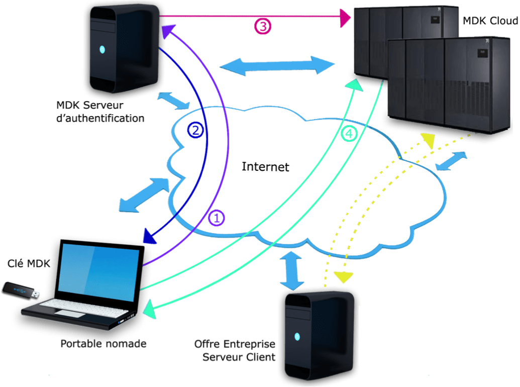 Que l’on soit particulier, professionnel ou entreprise, nous utilisons chaque jour un nombre considérable de fichiers informatiques : documents, images, photos, vidéos notamment. Nous tenons à ce que ces fichiers soient protégés des regards indésirables, et aussi, nous tenons à ces données soient sauvegardées en lieu sûr. Pour assurer cette mission, l’équipe technique de MDK Solutions, votre spécialiste en sécurité des données, a mis au point une technologie tout à la fois fiable, sûre, et facilitant considérablement la sécurisation des fichiers. Une infrastructure unique est ainsi mise à votre disposition, dans le cadre d’une installation redondante installée sur le territoire français. L’infrastructure de MDK Solutions se compose ainsi des éléments suivants : Une Clé USB Intelligente Permet l’accès aux services, connectée à un PC de bureau ou portable Le MDK Serveur d’Authentification Sécurise les échanges (identification, mot de passe, certificat, clef de cryptage, …) Gère le parc de Clés (initialisation, black listage, m-à-j des logiciels embarqués, …) Le MDK Cloud Supporte la partie Centrale des Services proposés 2 sites distants redondants, installés en France. Administration des comptes clients gérée par MDK Solutions ou par le Partenaire Le Serveur Client (dans le cadre de l’offre Entreprise) Stockage des données Clients Hébergé chez le Prestataire ou le Client